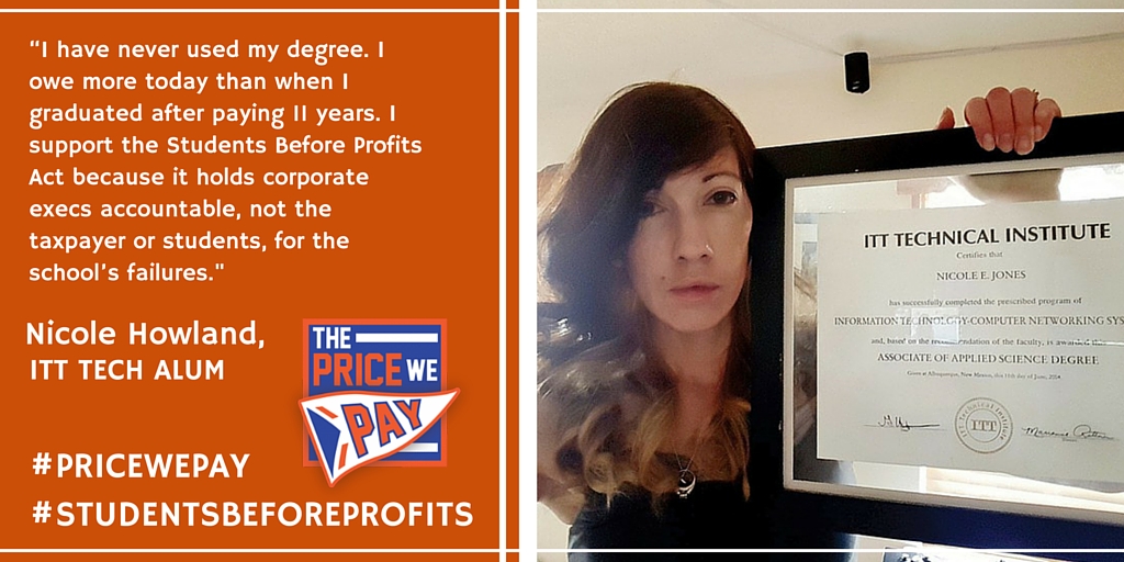 Nicole Howland is an alumna of ITT Tech. She said “I have never used my degree. I owe more today than when I graduated after paying 11 years. I support the Students Before Profits Act because it holds corporate execs accountable, not the taxpayer or students, for the school’s failures.”