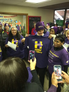I had the pleasure to greet SEIU Healthcare Michigan volunteers who I've known since my nursing home organizing days in 1993!I was filled with incredible pride to stand alongside SEIU Iowa President Cathy Glasson, who was jumping for joy to have 160 SEIU volunteers blanketing the state to win the caucus for Clinton.