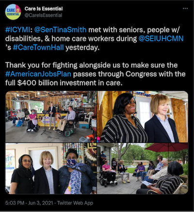 Over 19 in-person and virtual town halls enabled members of Congress, including Senators Tina Smith and Tammy Baldwin as well as Representatives Cory Bush and Frank J. Mrvan, consumers and home care workers to discuss the impacts a meaningful investment in care would create.