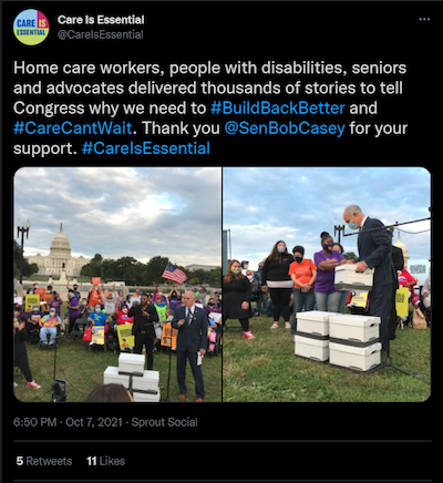 Consumers, allies, and home care workers signed petitions to persuade Congress to act. SEIU Locals 2015, HCII, and 1199N joined grassroots disability rights group ADAPT to deliver over 4.5 million petition signatures to Senator Bob Casey in support of care investments.